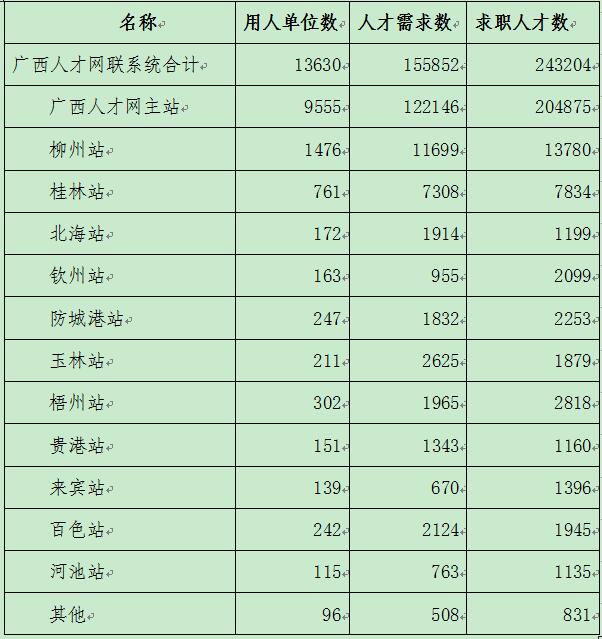 在各设区市人才网站分布中,广西人才网主站中用人单位共有9555家,需求人才数为122146人,求职人才数为204875人,占比分别为70.10%、78.37%及84.24%,其人才供求比为1.68。