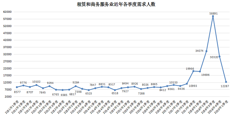 2019年第一季度,租赁和商务服务行业人才需求大幅下跌,需求人才数跌至12287人,与去年同期的19696人相比减少7409人,同比降幅达到37.62%,其中市场管理和职业中介服务业人才需求分别仅为796人和1417人,比上年同期分别减少6339人和530人,同比降幅分别达到88.84%和27.22%。