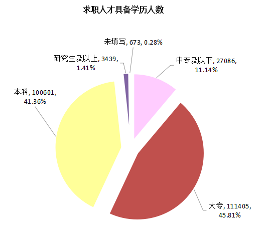 6.广西人才网联系统求职人才学历长期集中在大专和本科学历,其中大专学历求职人才数占比高达45.81%,本科学历求职人才数占比达41.36%,大专和本科学历的求职人才共计212006人,与上年同期的169984人相比增加42022人,增长24.72%。