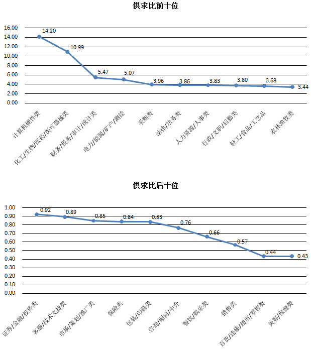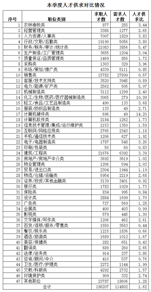总体供求比为1.62(即人才需求人数或职位数为1时,人才供给或求职人才数为1.62,下同),与去年同期相比增加0.11。其中在46个主要职位类型中,人才供求比大于2的职位类型达到21个,有13个类型的职位炙手可热,人才供求比大于3。