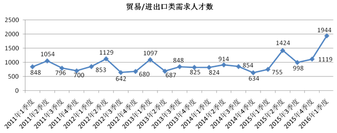 2016年一季度广西人才网联系统中贸易/进出口类职位人才需求出现突破性增长,其人才需求量达到创纪录的1944人,与去年同期相比增加1189人,增幅高达157.48%。