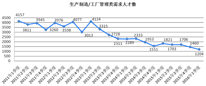 2016年一季度,在行业分布方面,制造业、信息传输/算机服务和软件业、金融业、房地产及批发和零售业等行业需求较多,所占比例分别达到15.44%、13.17%、12.23%、11.24%11.19%,这五个行业累计需求量达到72643人,占比达到63.28%。