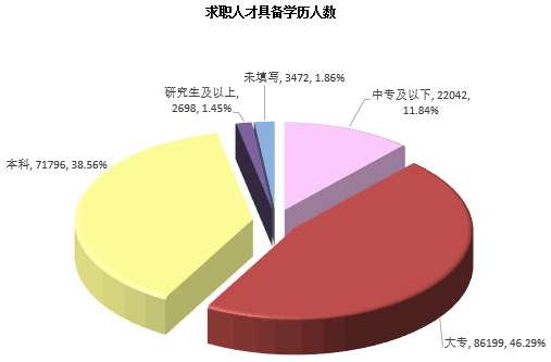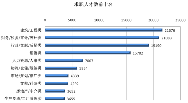 1.求职者人数达到186207人,同比上涨15.58%。位居求职榜前十名的职位:建筑/工程类、财务/税务/审计/统计类、行政/文职/后勤类、销售类、人力资源/人事类、物流/仓储/运输类、市场/策划/推广类、文教/科研类、房地产/中介类及经营管理类等职位类型。这十个职位类型的求职人才数量总计106670人,其中求职人才数超过1万人的有建筑/工程类、财务/税务/审计/统计类、行政/文职/后勤类和销售类,这四个职位类别名列前四位。