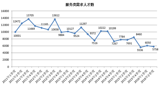 5、服务类职位总需求仅为5758人,同比降幅达到25.13%。