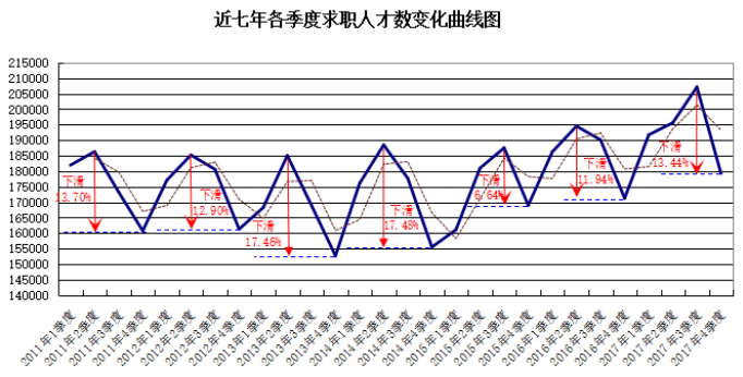 近七年各季度求职人才数变化曲线图: