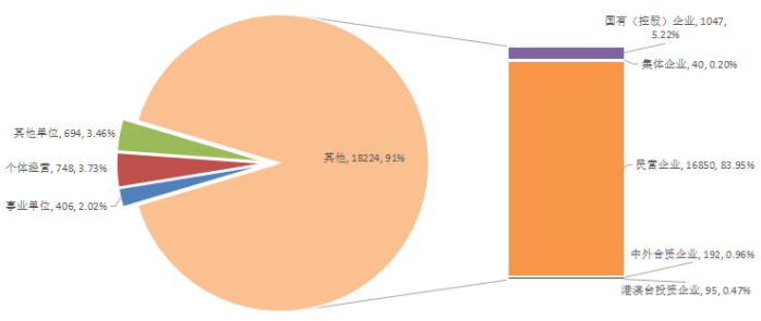 2017年广西人才网联系统中,用人单位数量达到20072家,与上年度相比大幅增长14.07%,用人单位中企业共有18224家,占比90.79%,与上年度相比增长10.65%,其中国有(控股)企业达到1047家,比上年度大幅增长23.47%,而民营企业达到16850家,比上年度增长10.09%,占比高达83.95%,是人才需求的主要来源。