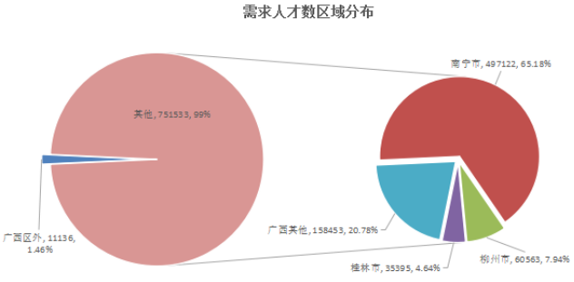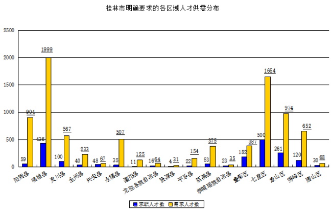 期望在桂林市工作的求职人才数为25396人,占比6.34%,工作地在桂林市的需求人才数为35395人,占比4.64%。对桂林市具体工作区域没有明确要求的求职人才有23456人,占比5.86%,而有明确要求的区域中,桂林市七星区和临桂县是比较热门的求职地点,求职人才数分别有500人和436人,明确工作地在这两个区的用人单位需求人才数分别为1654人和1999人。