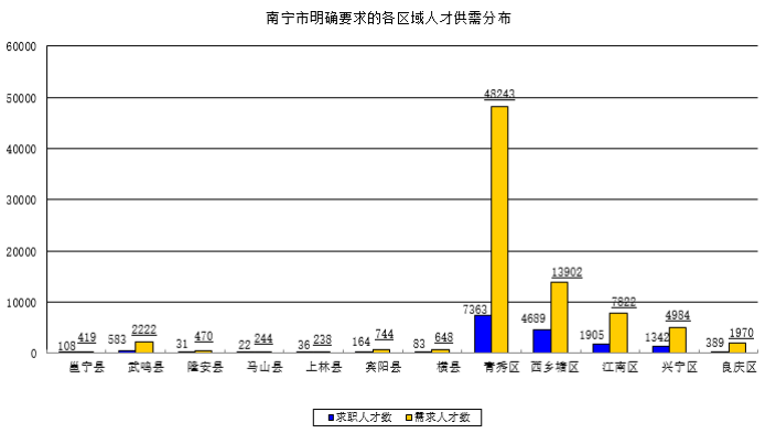 其中期望在南宁市工作的求职人才数达到231593人,占比57.81%,而工作地在南宁市的需求人才数达到497122人,占比65.18%。对南宁市具体工作区域没有明确要求的求职人才有214878人,占比53.64%,而有明确要求的区域中,南宁市青秀区和西乡塘区是比较热门的求职地点,求职人才数分别有7363人和4689人,明确工作地在这两个区的用人单位需求人才数分别达到48243人和13902人。