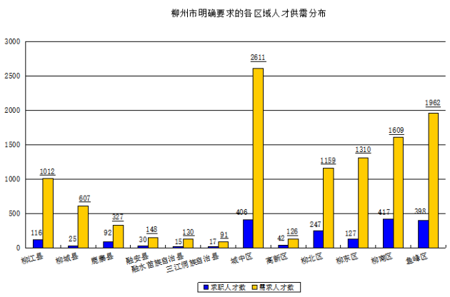 期望在柳州市工作的求职人才数为35958人,占比8.98%,工作地在柳州市的需求人才数达到60563人,占比7.94%。对柳州市具体工作区域没有明确要求的求职人才有34026人,占比8.49%,而有明确要求的区域中,柳州市柳南区、城中区以及鱼峰区是比较热门的求职地点,求职人才数分别为417人、406人和398人,明确工作地用人单位需求人才数也集中在这三个区域,需求人才数分别为1609人、2611人以及1962人。