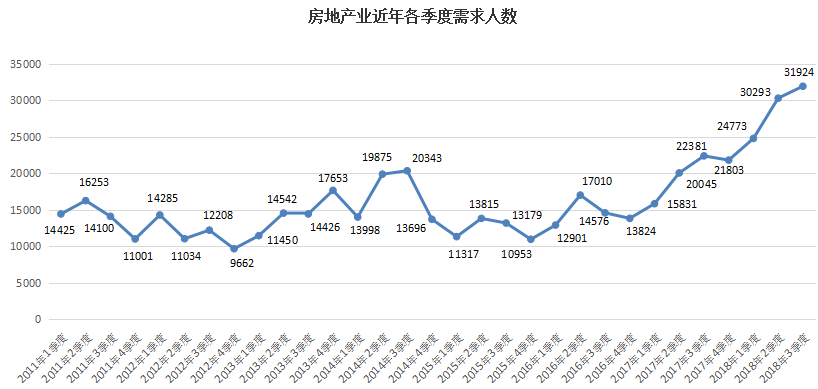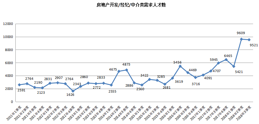3. 房地产开发/经纪/中介类职位的需求人才数达到9521人,与上年同期的5945人相比增加了3576人,增幅高达60.15%。