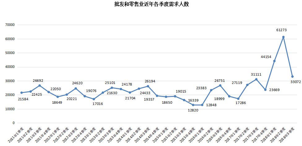 3. 租赁和商务服务业人才需求再创新高,突破5万大关,其需求人才数达到58891人,与去年同期的10993人相比增加47898人,同比涨幅高达435.71%,成为本季度人才需求增长幅度最大的行业类型。