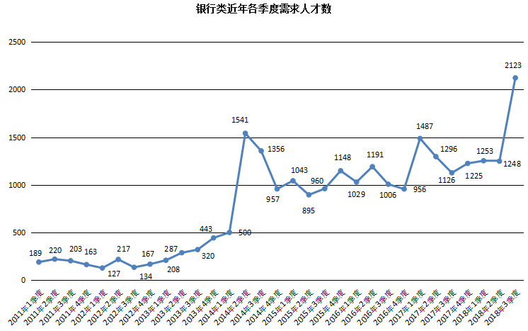 2018年第三季度,广西人才网联系统中银行类职位人才需求量创历史新高,达到2123人,与上年同期的1126人相比增加997人,同比大幅增长88.54%。其中,银行卡、电子银行业务推广人员职位与上年同期相比增加了579人,涨幅达到1867.74%,是该类职位的主要增长点。