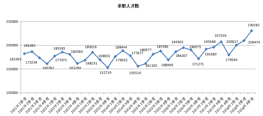 2018年第三季度,广西人才网联系统的求职人才数创历史新高,达到230282人,同比涨幅为11.19%。