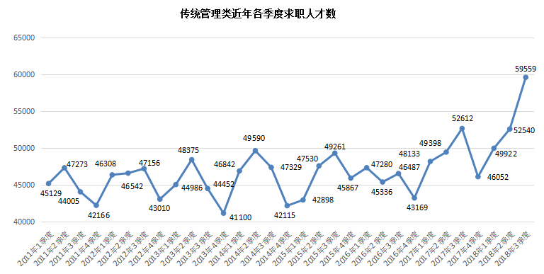 3. 三大传统管理类职位的人才供应总量保持良好的增长势头,其求职人才数为59559人,与上年同期相比增长6947人,同比增长13.20%。