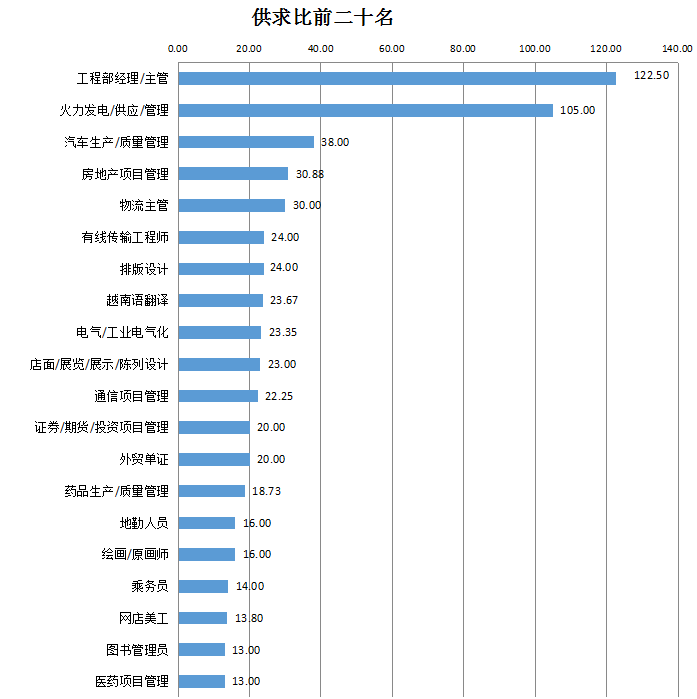 2018年第三季度,在人才竞争激烈程度的具体职位排名中,工程部经理/主管(属房地产开发类)和火力发电/供应/管理职位分列前两位,由于需求极少,这两个职位的人才供求比分别达到122.50和105.00,均超过100人竞争1个岗位。